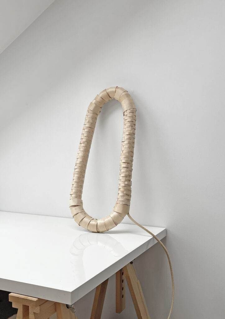 The layered structure is locally reinforced with silver-tone metal fittings, while the cable carries a natural jute texture. Unlike many of my objects produced by manufacturers, this piece was entirely hand-made over six weeks – a slow, meditative process and a grounding practice.