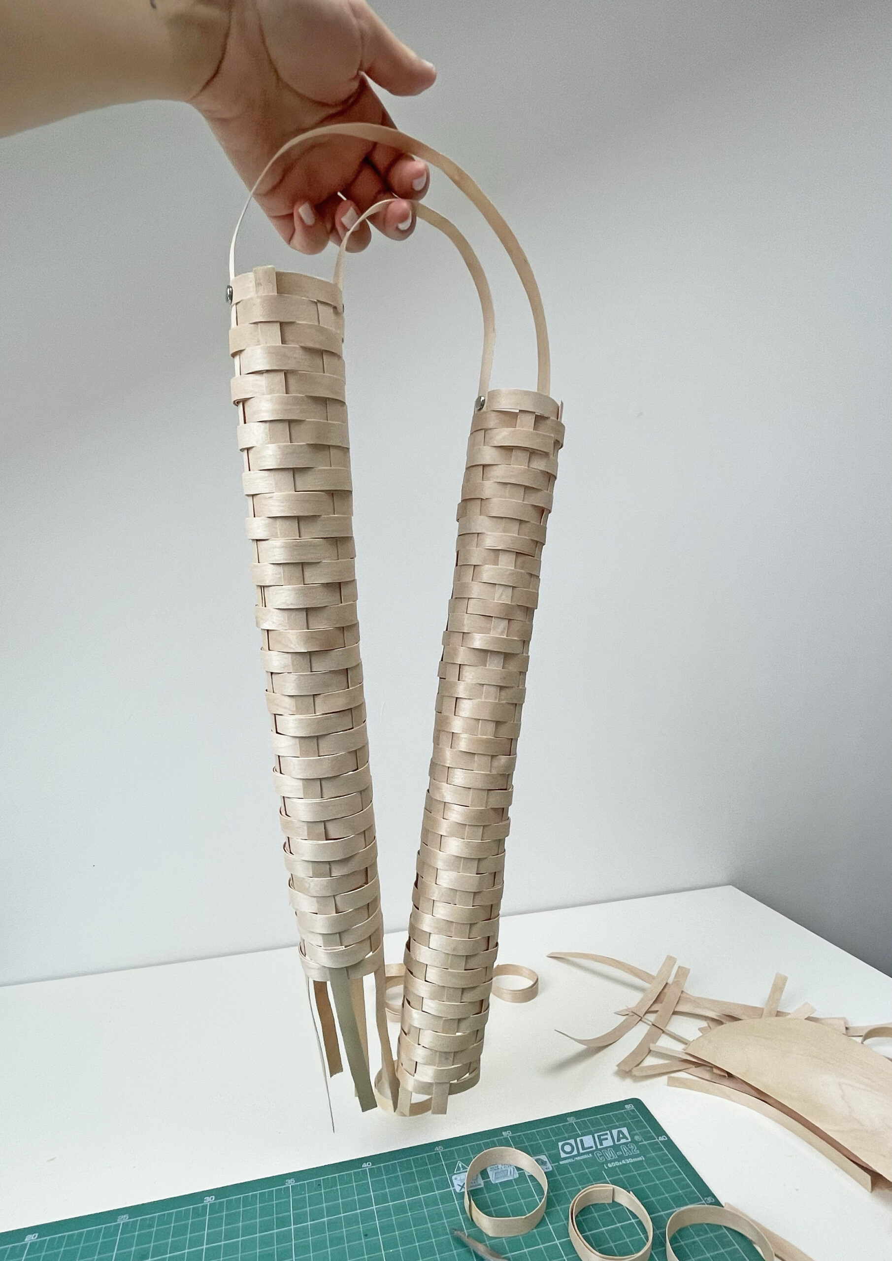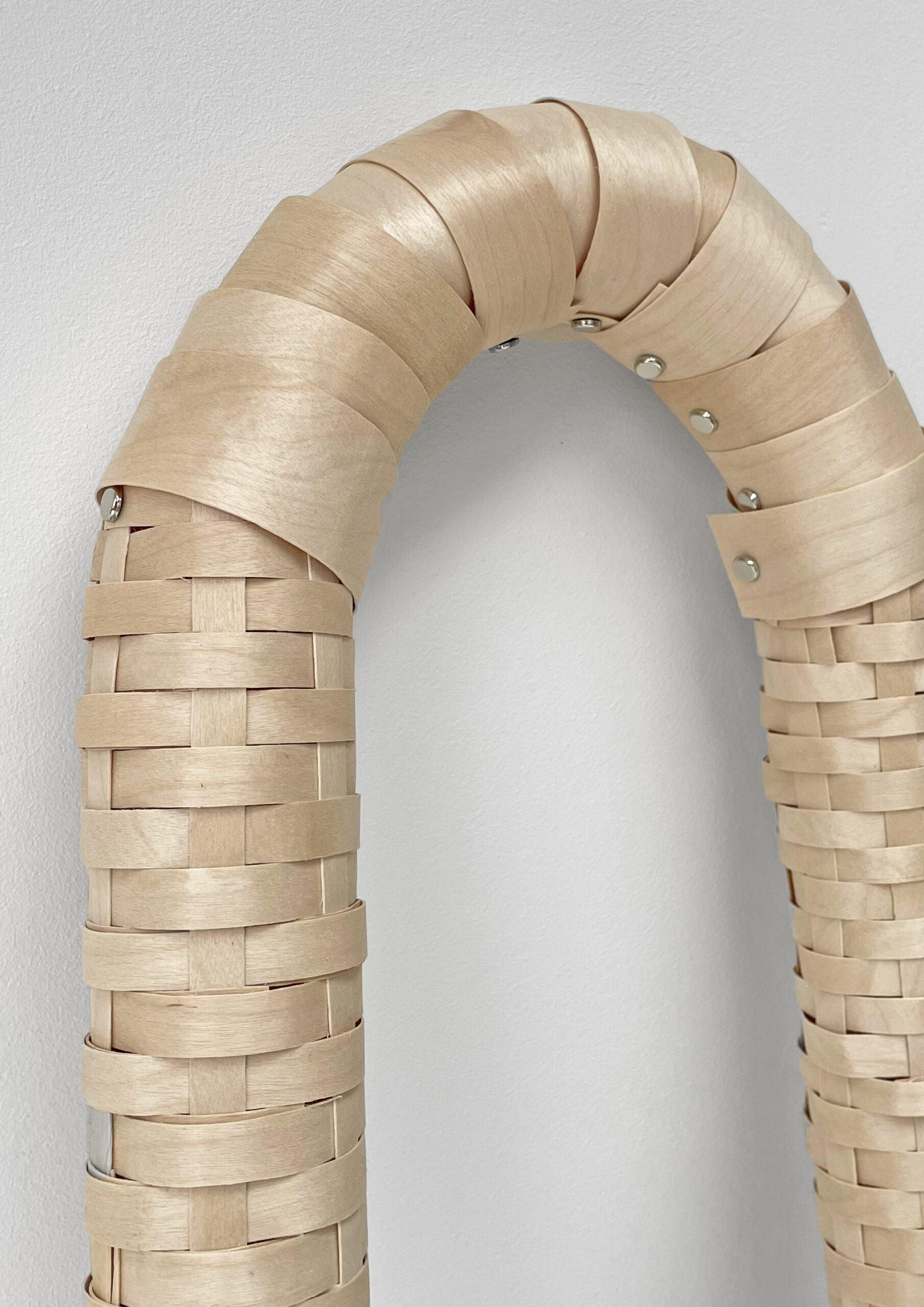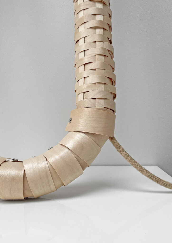 The form originates from an extended circular geometry. Its subtle widening on one side emerged unintentionally during the making process. Each strip of birch veneer was cut, bent and fixed by hand, and the impossibility of maintaining perfect continuity became a defining quality rather than a flaw.