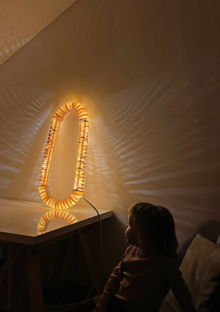 VIRO was created from a simple domestic need – to introduce an emotional source of light into the home. Placed on the living room windowsill, it casts soft, layered shadows and a gentle glow that echoes the presence of daylight entering through a window, especially during the early darkness of winter. Designed to lean against the wall on a windowsill, yet easily movable or suspendable if needed.
